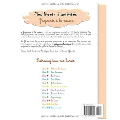 Il s'agit ici du TOME 1 qui correspond aux 3 premiers livrets du programme "J'apprends à la maison". Ce manuel a été écrit par la rédactrice du blog : Trucs de ma maman. Au total, 91 ACTIVITÉS destinées aux enfants dès 2 ans 1/2. Des activités à réaliser à la maison afin d’accompagner votre enfant dans les différents apprentissages, tout en douceur. - ATELIERS AUTONOMES - ATELIERS DE VIE PRATIQUE MONTESSORI - GRAPHISME - MATHÉMATIQUE - LANGAGE - LECTURE - EXPLORER LE MONDE Un thème par numéro : Mois 1 : Ateliers Montessori Mois 2 : C'est l'automne ! Mois 3 : Les 5 sens Vous pouvez aussi vous procurer l'ensemble des livrets du programme : TOME 1 : Mois 1 : Ateliers Montessori Mois 2 : L’automne Mois 3 : Les 5 sens TOME 2 : Mois 4 : L’hiver Mois 5 : L’alimentation Mois 6 : Les animaux marins TOME 3 : Mois 7 : Le printemps Mois 8 : Le corps humain Mois 9 : Le jardinage TOME 4 : Mois 10 : La ferme Mois 11 : L’été Mois 12 : Les vacances