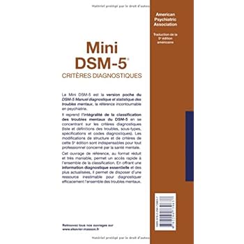 Le Mini DSM-5 est la version poche du DSM-5 Manuel diagnostique et statistique des troubles mentaux la référence incontournable en psychiatrie. Il reprend l'intégralité de la classification des troubles mentaux du DSM-5 en se concentrant sur les critères diagnostiques (liste et définitions des troubles sous-types spécifications et codes diagnostiques). Les modifications de structure et de critères de cette 5e édition sont indispensables pour tout professionnel concerné par la santé mentale. Cet ouvrage de référence au format réduit et très maniable permet un accès rapide à l'ensemble de la classification. En offrant une information diagnostique essentielle et des plus actualisées il permet de disposer d'une ressource inestimable pour diagnostiquer efficacement l'ensemble des troubles mentaux.
