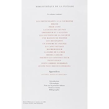 Ce volume a 1890 pages. Il contient les 16 ou 17 pièces majeures du théâtre d Ibsen selon que l on considère "Empereur et Galiléen" comme une ou deux pièces. On y trouve bien sûr "Peer Gynt", "Une maison de poupée" et "La Cane sauvage", mais aussi "Brand" et "Petit Eyolf", représentés récemment pour la première fois à l attention du public francais.C est à Régis Boyer, traducteur infatigable, défenseur et introducteur des sagas islandaises et de toute la littérature scandinave et nordique qui compte, que l on doit ce volume incomparable. Son introduction, ses notes et les appendices qu il livre sont remarquables de précisions sans jamais friser l érudition pédante que l on trouve parfois chez certains spécialistes universitaires.Il met clairement en lumière les thèmes essentiels du grand Norvégien : le désir qu a chacun de nous d accomplir sa vocation, le doute, le "mensonge vital" que nous entretenons sur nous-mêmes pour nous permettre d accepter de vivre, l hypocrisie des "soutiens de la société", le destin inexorable qui nous poursuit. A cela s ajoute chez Ibsen le désir lancinant de pénétrer la psychologie féminine, sans doute la préoccupation principale de toute sa vie d homme de théâtre.Nora Helmer, Ellida Wangel, Hedda Gabler ou Rebekka West sont des figures inoubliables de détermination ou de contradictions comme Brand et Peer Gynt le sont pour leur désir de vivre ou leur attirance morbide pour la destruction.L essentiel de ce théâtre est l éternel tragédie de l homme confronté à son destin et incapable de le surmonter tout seul.Ce volume est à mettre impérativement dans sa bibliothèque d honnête homme du début du XXIe siècle.